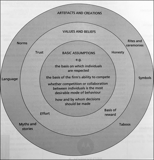 - Basic assumptions, values and surface manifestations (Schein, 2004):