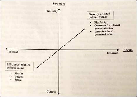 Hock et al (2016) note that there are multiple approaches to conceptualise an organisation’s culture. They adopt a useful model that contrasts novelty-oriented cultural values (emphasising flexible structures and external focus) with efficiency-oriented values (emphasising control structures and internal focus):